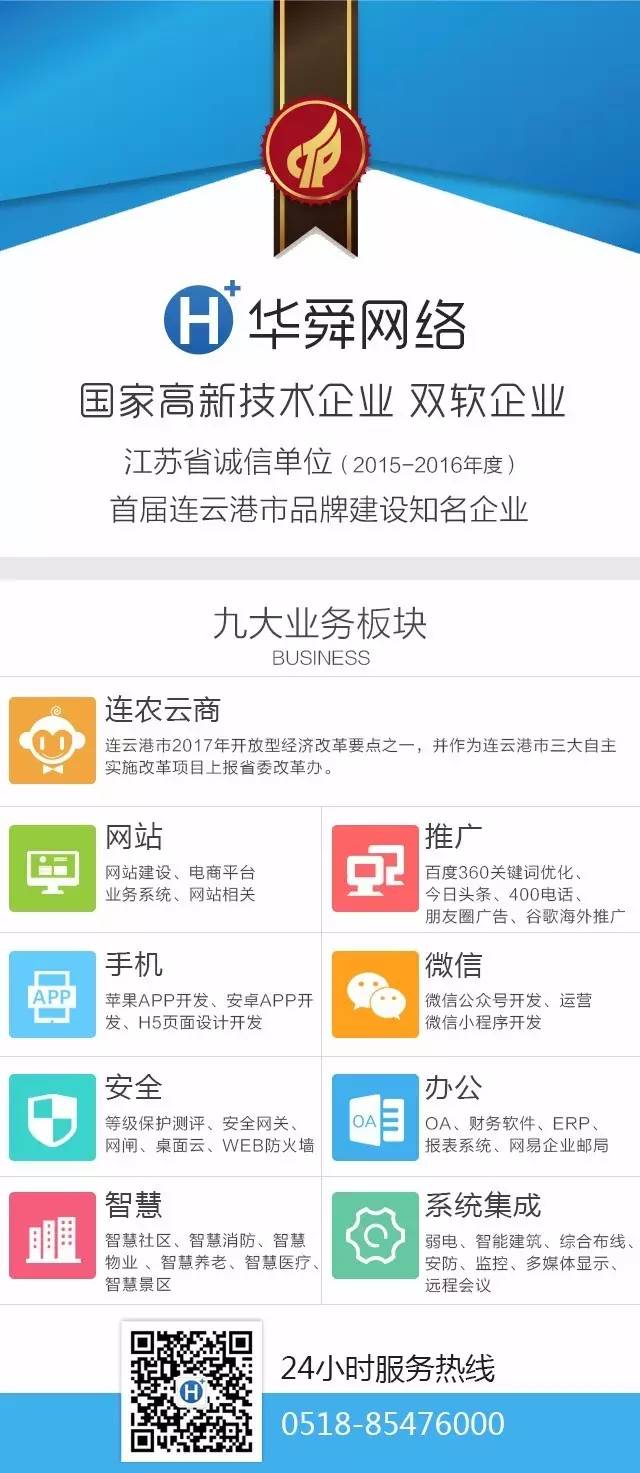 华舜网络现为国家级高新技术企业、江苏省“双软”企业、江苏省诚信单位、连云港科技小巨人企业、连云港品牌协会副会长单位、连云港市广告协会理事单位等。